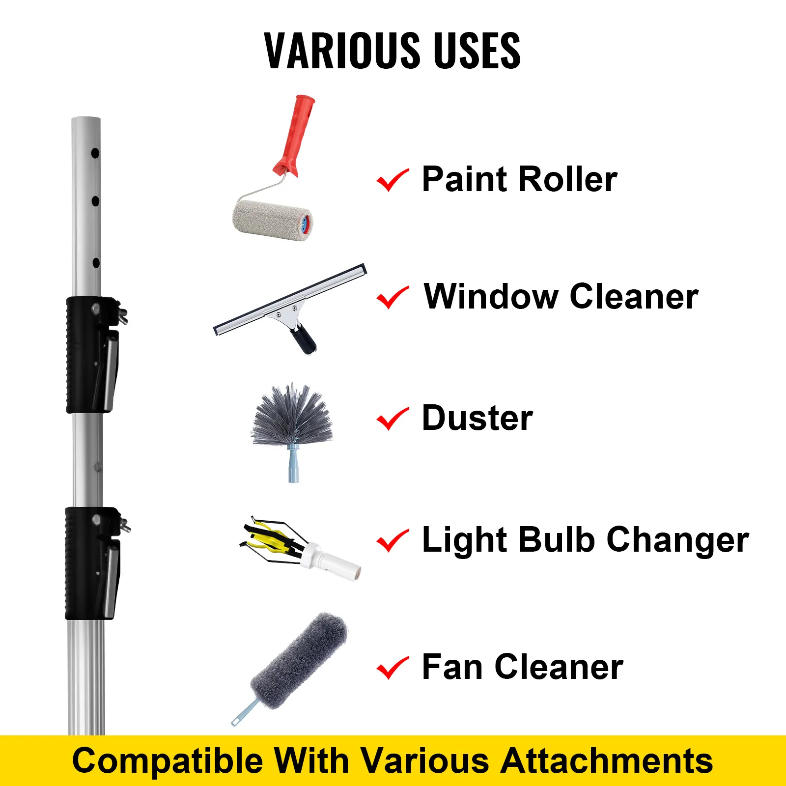 Adecuado para ser conectado con varios accesorios de varilla (no incluidos), como rodillo de pintura, cepillo de limpieza, plumeros, cambiador de bombillas, gancho, recogedor de frutas, etc.