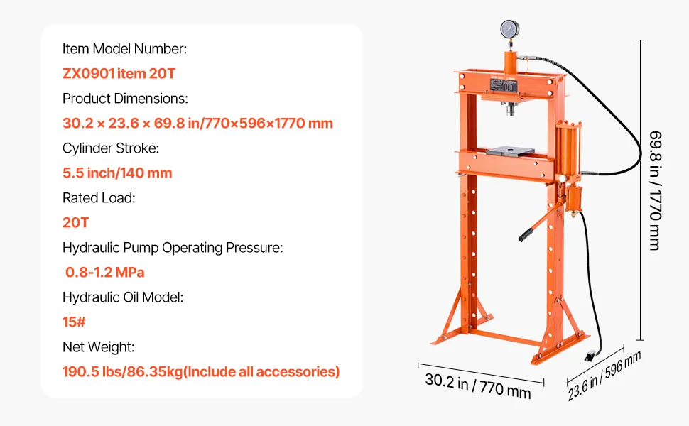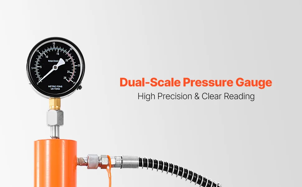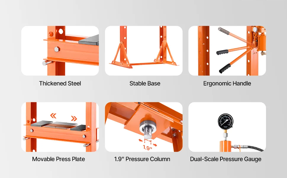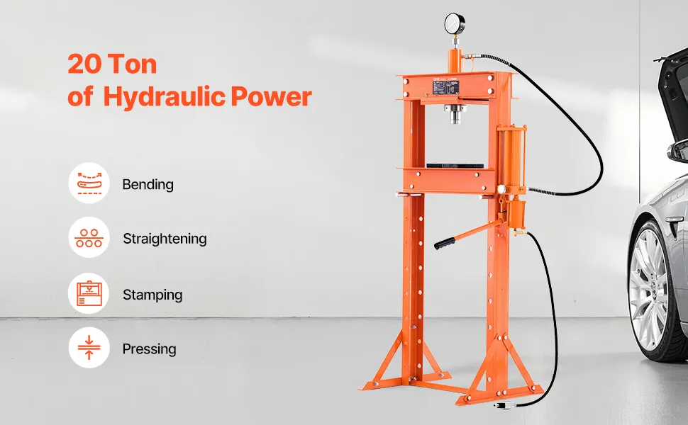 Capacidad de carga de 20 toneladas: Nuestra prensa hidráulica le ayuda a desmontar e instalar fácilmente bujes, rótulas, juntas universales y más, así como a enderezar, doblar y estampar piezas de metal. Tanto si es un profesional como un aficionado a la reparación de automóviles, permite una operación rápida y sencilla