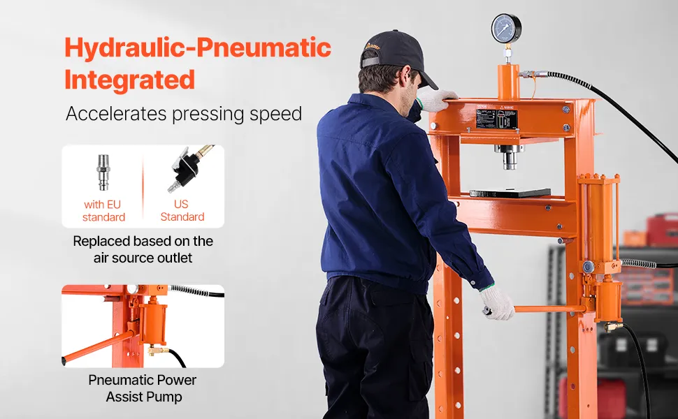 Hidráulico y neumático: Equipado con una bomba de asistencia neumática y un conector rápido para una fácil conexión a un compresor de aire, el sistema de esta prensa de taller hidráulica reduce significativamente el esfuerzo, lo que permite una operación más suave y eficiente, especialmente durante tareas pesadas