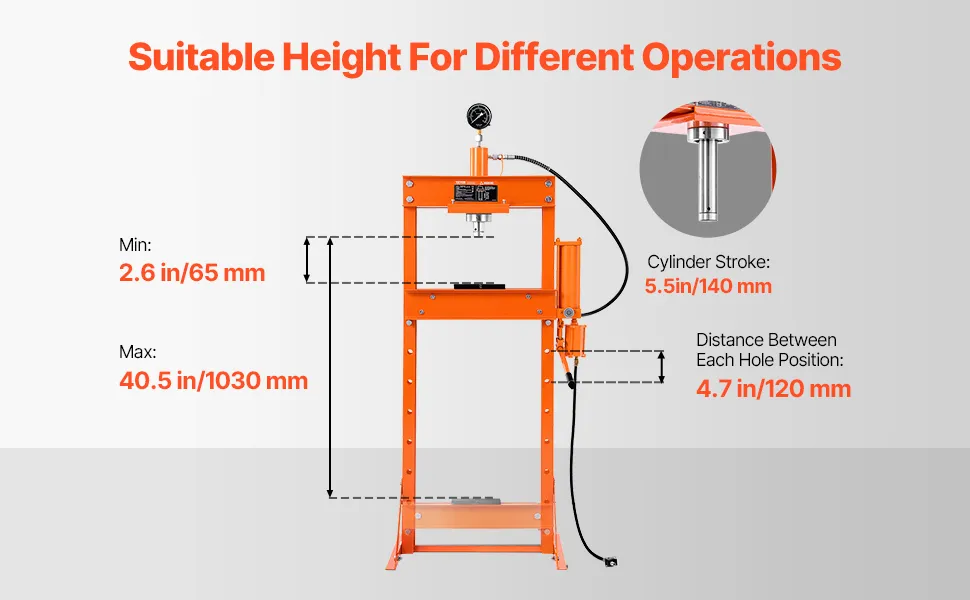 Altura ajustable: La mesa de trabajo de la prensa hidráulica de taller cuenta con un sistema de pasadores de ajuste rápido con 9 configuraciones de altura, que van desde 65-1030 mm, lo que proporciona posiciones de trabajo flexibles. La carrera del cilindro es de 140 mm. Nota: Exceder el rango de carrera del cilindro puede causar daños a los sellos del cilindro