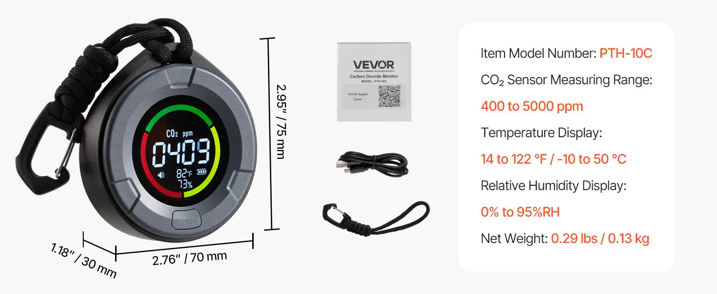 VEVOR Monitor de Dióxido de Carbono, 400 a 5000 ppm, con Pantalla de Temperatura y Humedad, Sensor NDIR de 4,5 m, para Exteriores, Hogar, Oficina, Coche, Ligero y Portátil, 70 x 30 x 75 mm, Negro