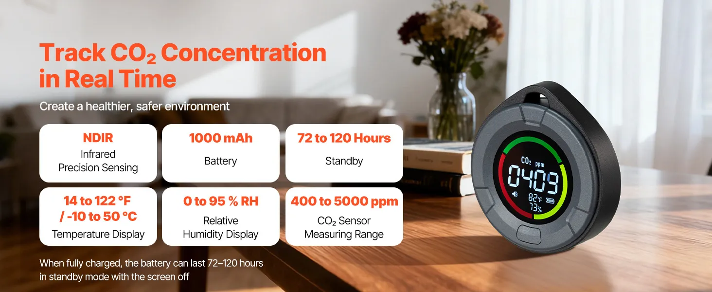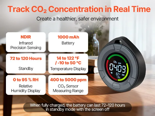 Su sensor infrarrojo de alta precisión garantiza lecturas estables en diferentes concentraciones. Con una batería de larga duración (72-120 horas en modo de espera) y un funcionamiento intuitivo, es ideal para exteriores, oficinas, aulas y laboratorios.