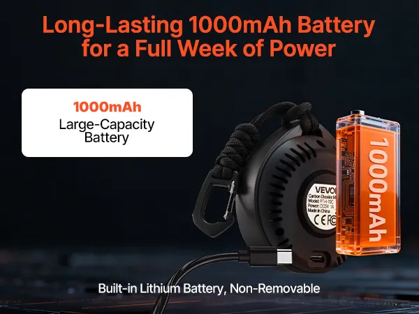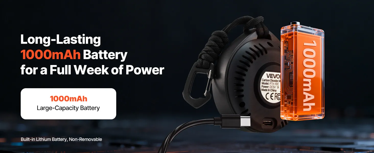 Diseñado para un uso prolongado, este sensor de CO₂ cuenta con una batería de 1000 mAh que proporciona entre 72 y 120 horas de funcionamiento continuo. Ideal para la monitorización portátil o en exteriores, garantiza lecturas fiables de CO₂ en aulas, oficinas, invernaderos y otros espacios.