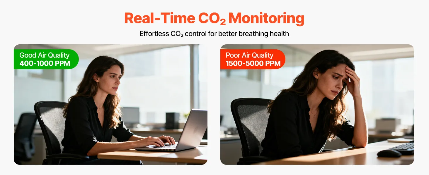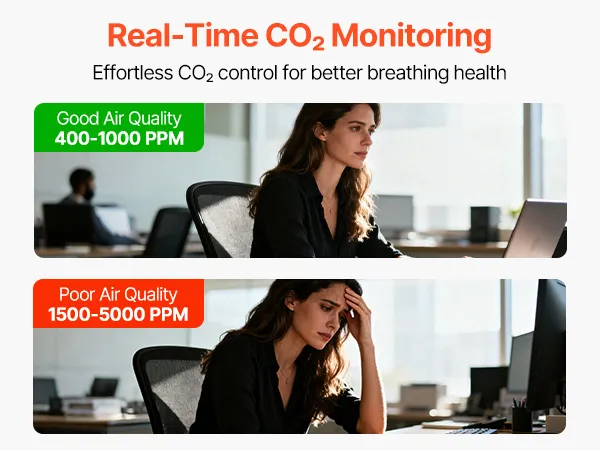 Monitoreo instantáneo del aire: Controle la calidad del aire interior al instante con este detector de dióxido de carbono (CO₂). Un sensor infrarrojo de alta sensibilidad mide el CO₂ en tiempo real, mientras que los indicadores multicolores guían visualmente las decisiones de ventilación, facilitando el monitoreo de la calidad del aire interior de un vistazo