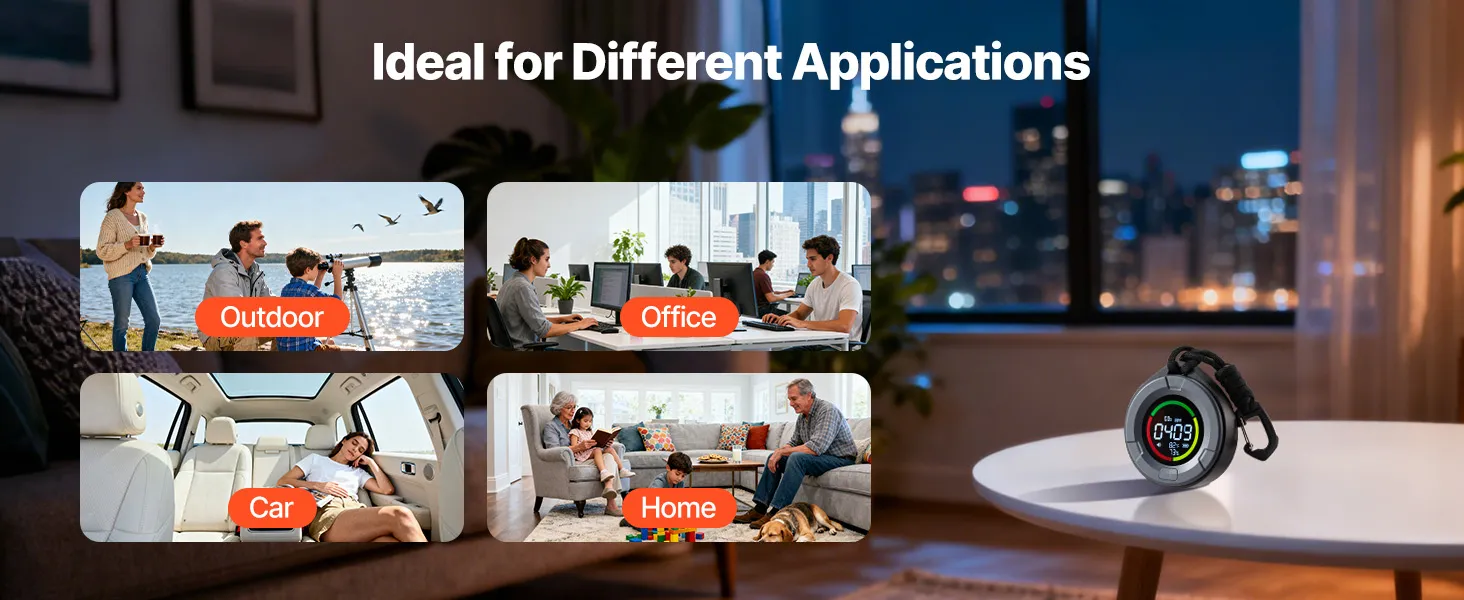 Batería de larga duración: Equipado con una batería de 1000 mAh, este medidor de calidad del aire interior funciona de forma continua entre 72 y 120 horas. Su autonomía prolongada minimiza la necesidad de recargas frecuentes, lo que lo hace ideal para la monitorización móvil a largo plazo en oficinas, aulas, invernaderos o entornos exteriores