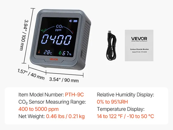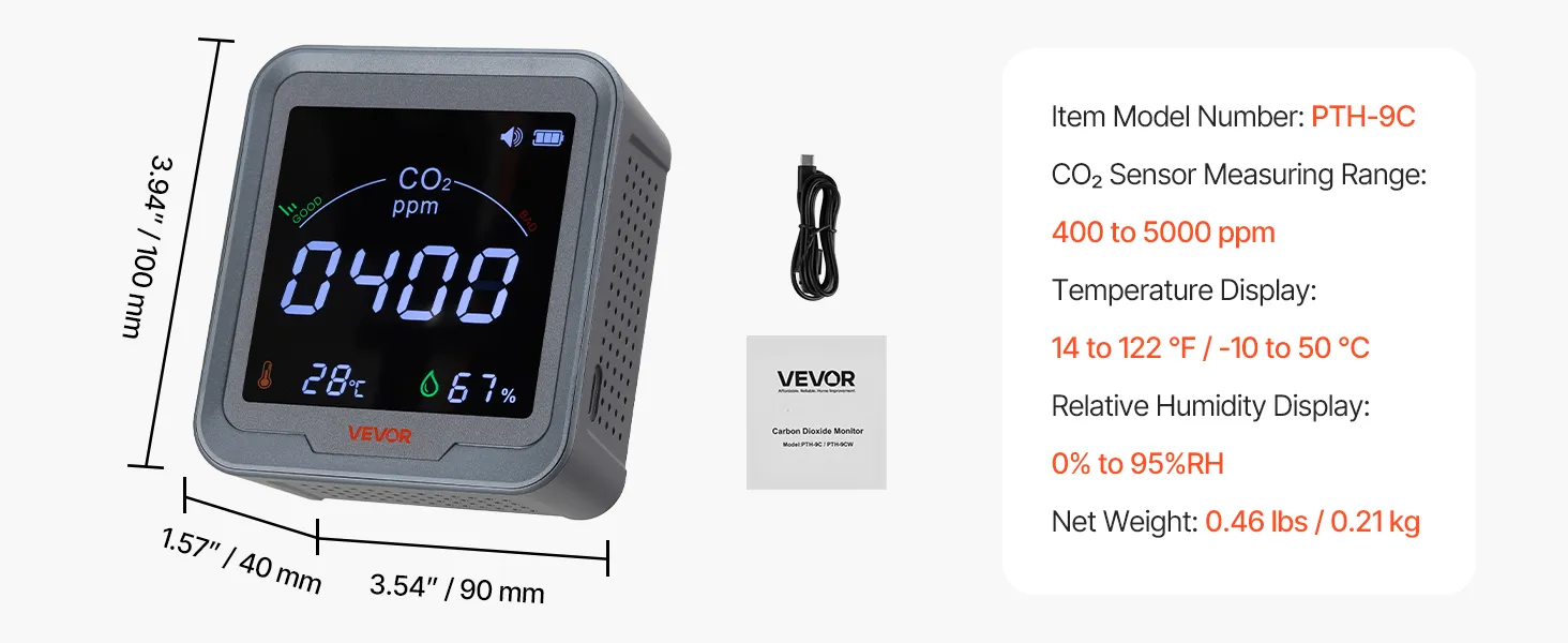 VEVOR Monitor de Dióxido de Carbono, en Tiempo Real, con Pantalla de Temperatura y Humedad, Sensor NDIR de 4,5 m, para Mesita de Noche, Hogar, Oficina, Coche, Ligero y Portátil, 90 x 40 x 100 mm