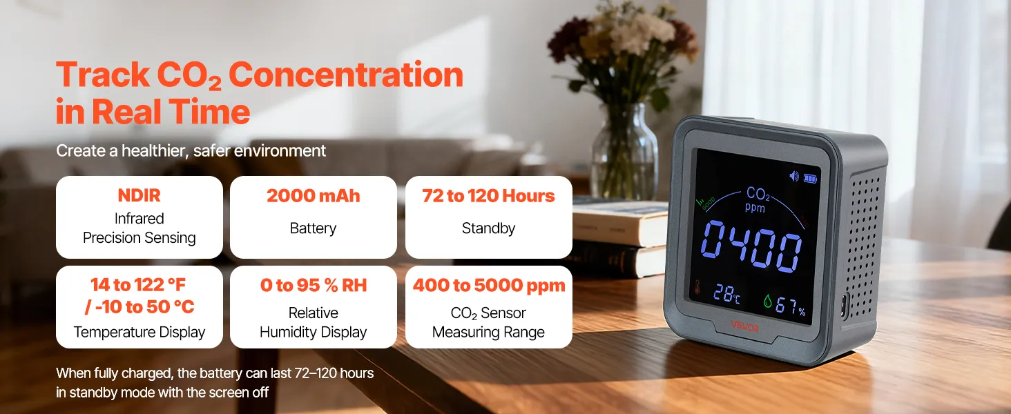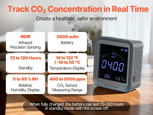 Su sensor infrarrojo de alta precisión garantiza lecturas estables en diferentes concentraciones. Con una batería de larga duración (72-120 horas en modo de espera) y un funcionamiento intuitivo, es ideal para exteriores, oficinas, aulas y laboratorios.