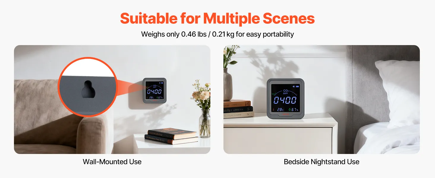Este medidor de CO₂ pesa solo 0,21 kg y tiene un diseño compacto que cabe fácilmente en el bolsillo o el bolso. Ideal para aulas, oficinas e invernaderos, proporciona una monitorización fiable del CO₂ y es muy portátil y práctico para el uso diario.