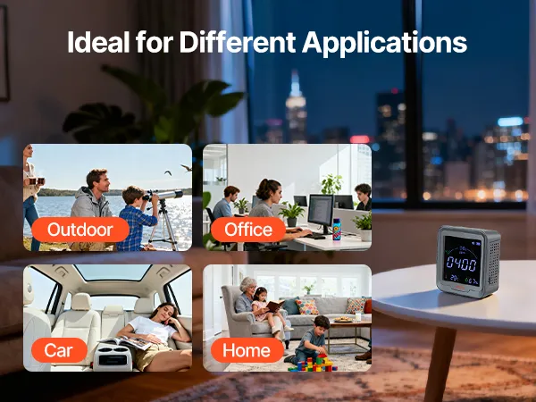 Batería de larga duración: Equipado con una batería de 2000 mAh, este medidor de calidad del aire interior funciona de forma continua entre 72 y 120 horas. Su autonomía prolongada minimiza la necesidad de recargas frecuentes, lo que lo hace ideal para la monitorización móvil a largo plazo en oficinas, aulas, invernaderos o entornos exteriores