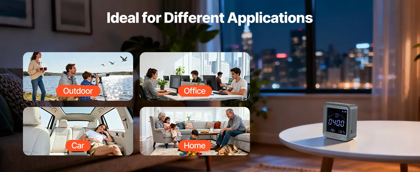Se adapta a diferentes espacios y grupos de usuarios, proporcionando una monitorización fiable del CO₂ en diversas situaciones, a la vez que ofrece una gestión cómoda y constante del aire en interiores y en dispositivos móviles.