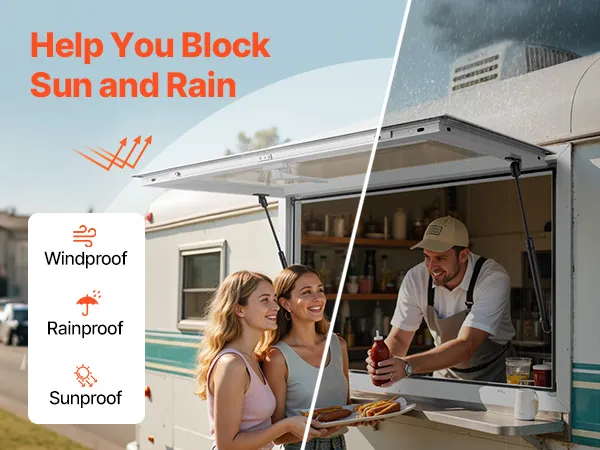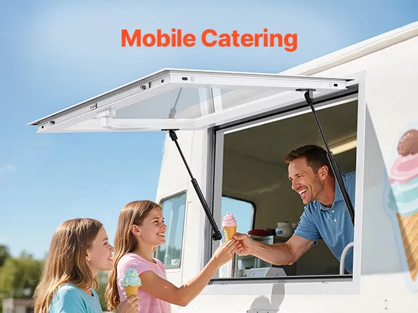 Fácil de abrir: Con un amplio ángulo de apertura de 85° y una vista despejada, la ventana del camión de concesión está equipada con dos barras hidráulicas para su apertura. El toldo incluido protege contra la lluvia intensa, el sol y los robos, lo que le permite atender a los clientes con facilidad