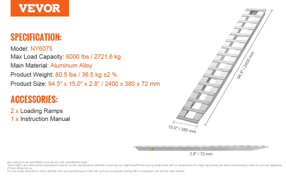 Capacidad de carga máxima de 2721,6 kg: Esta rampa de carga extendida para camiones ha sido probada en seguridad y puede soportar hasta 2721,6 kg. Cada rampa mide 240 x 38 cm, adecuada para vehículos con ruedas o equipos con neumáticos de hasta 35,6 cm de ancho y es ideal para usuarios que requieren una pendiente larga y suave.