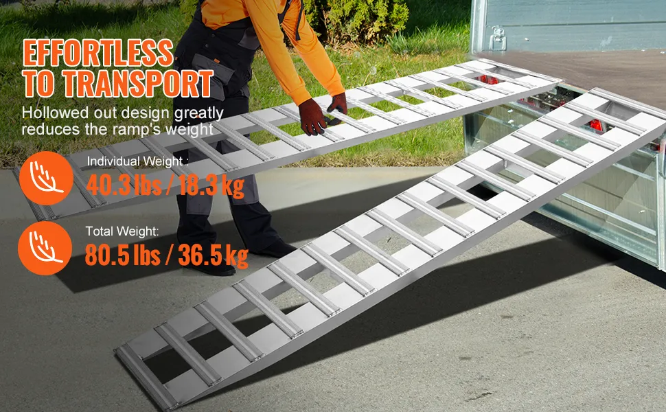 Liviana y portátil: Nuestra rampa para remolque es liviana, con un peso total de 80 libras y cada rampa pesa solo 40 libras, lo que facilita su movimiento. Cuando no estén en uso, las rampas se pueden guardar de forma compacta en su garaje o camión.