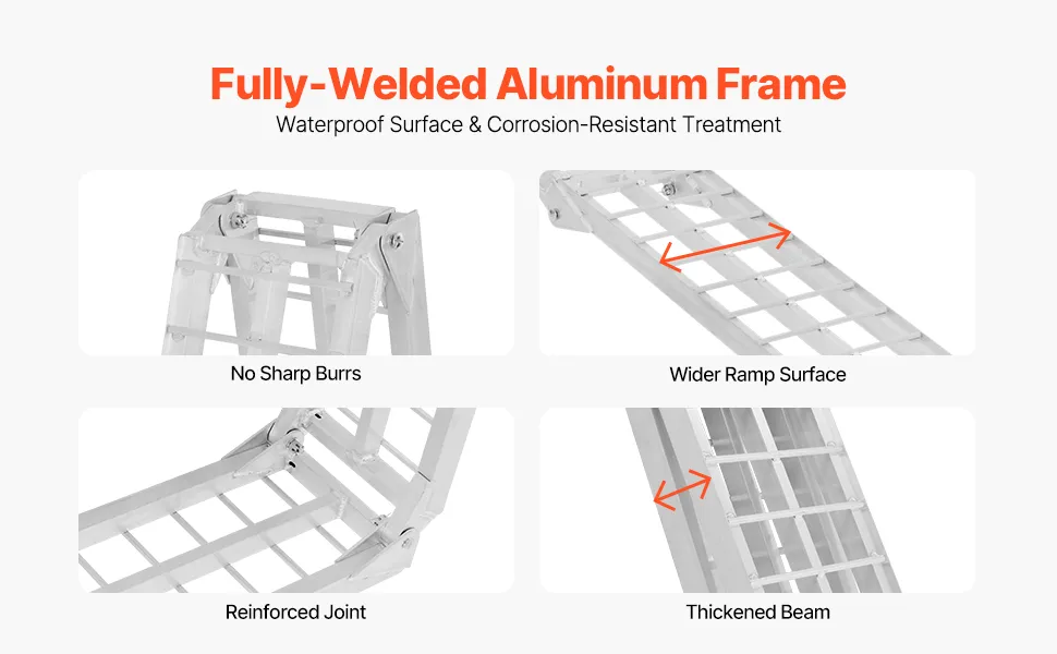 Rampa de aluminio: Fabricada completamente de aluminio con soldadura de precisión y juntas herméticas, la rampa tiene una superficie resistente a la corrosión y bordes lisos y sin rebabas. La superficie engrosada y ensanchada de la rampa distribuye el peso de manera uniforme, lo que garantiza la durabilidad sin agrietarse ni colapsar con el tiempo