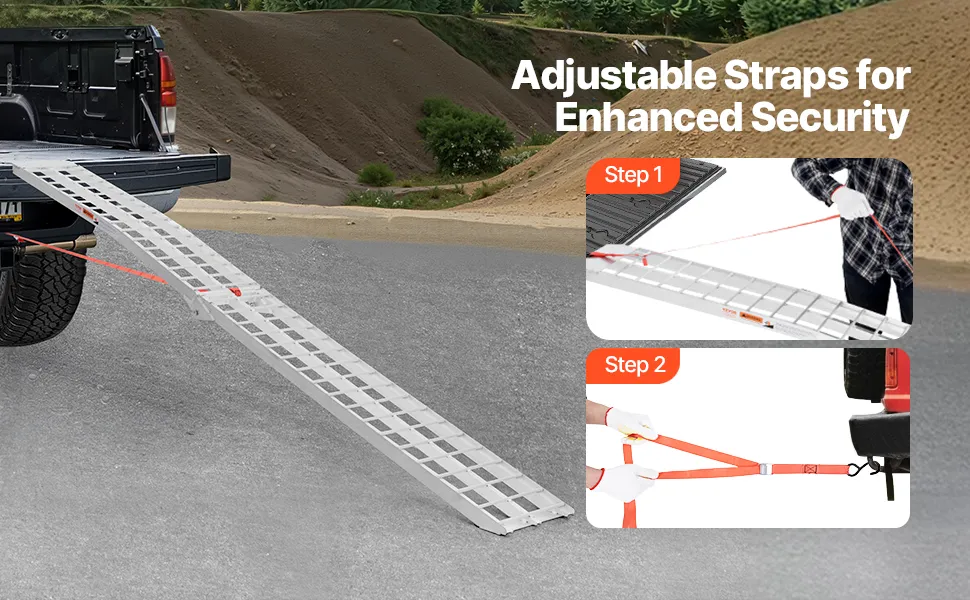 Reforzado con correas: Equipado con correas de seguridad ajustables, la rampa se fija firmemente al borde de la camioneta, minimizando el movimiento y evitando deslizamientos o desplazamientos durante la carga, lo que garantiza un transporte estable y seguro del vehículo