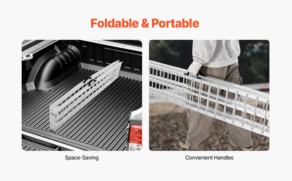 Equipada con un asa de transporte y un diseño plegable, la rampa se puede plegar de forma compacta cuando no está en uso, lo que hace que sea fácil de transportar, almacenar y ahorrar espacio mientras viaja.