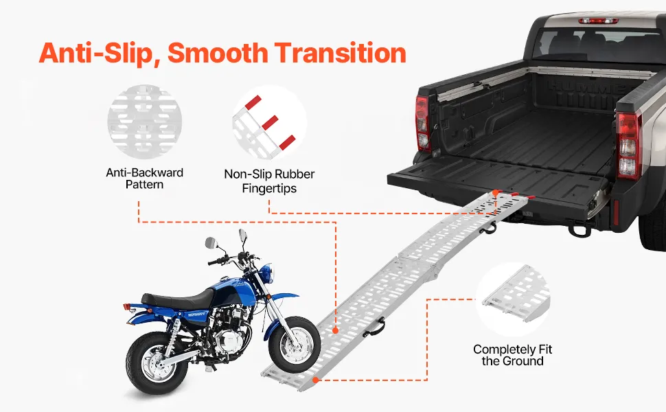 Estabilidad antideslizante: Diseñada con placas de goma con garras de tres dedos, la rampa se agarra firmemente al borde de la camioneta, evitando que se mueva durante el uso. El patrón de superficie antideslizante garantiza un transporte seguro en pendientes. Nota: Evite exceder la capacidad de carga recomendada para prolongar la vida útil de la rampa