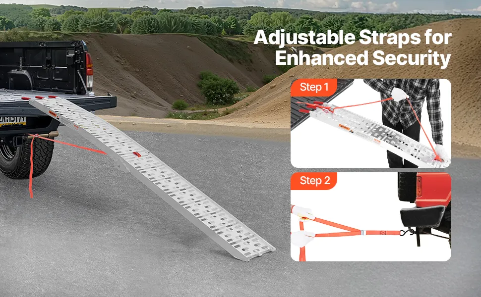 Reforzado con correas: Equipado con correas de seguridad ajustables, la rampa se fija firmemente al borde de la camioneta, minimizando el movimiento y evitando deslizamientos o desplazamientos durante la carga, lo que garantiza un transporte estable y seguro del vehículo