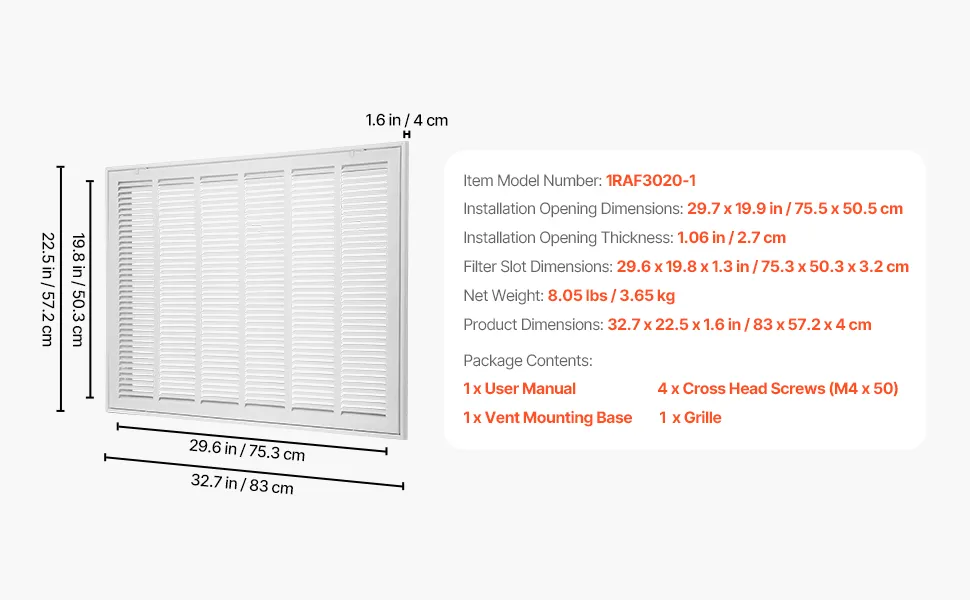 VEVOR Rejilla de Filtro de Aire de Retorno, Se Adapta a la Abertura del Conducto de 75,5 x 50,5 cm de Ancho, Filtro no Incluido, para Pared, con Recubrimiento en Polvo, 83 x 57,2 x 4 cm, Blanco