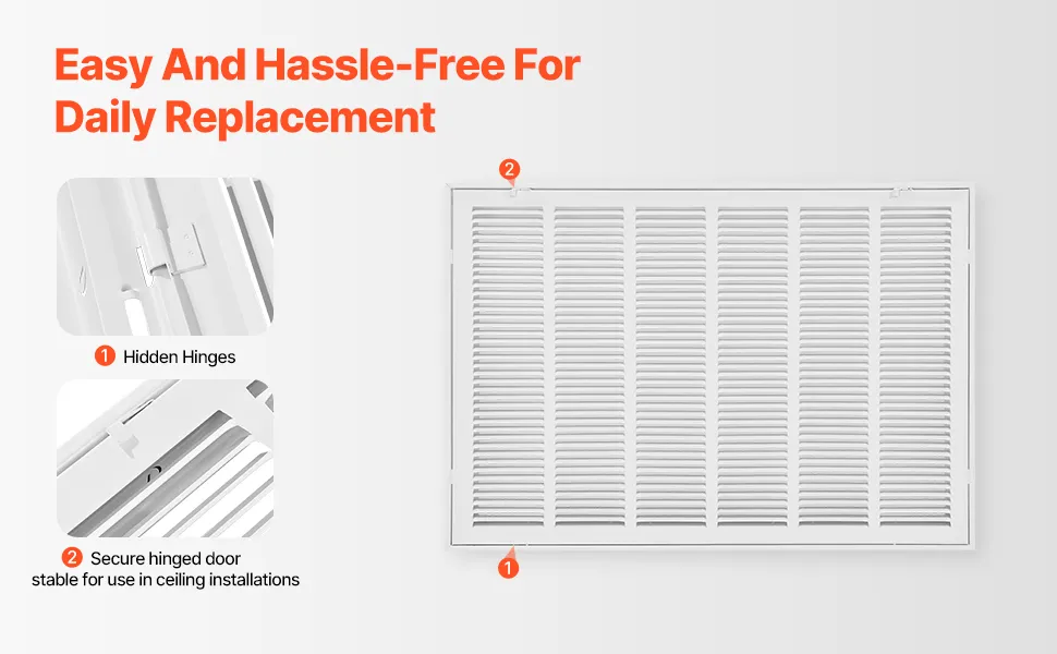 El innovador diseño de pestillo de la rejilla del filtro de aire de retorno permite una fácil apertura y cierre, lo que hace que la limpieza y el reemplazo sean más convenientes. La bisagra oculta es adecuada para la instalación en el techo, lo que garantiza una alta seguridad.