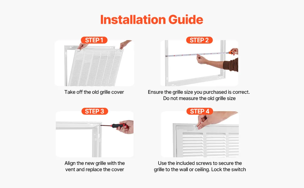 Resistente al óxido y duradera: Fabricada con acero de alta resistencia, esta rejilla de retorno de aire resiste la presión y los rayones. El proceso de estampado de acero garantiza que no tenga bordes afilados y el revestimiento en polvo resistente al óxido evita que se astille, raye y decolore. Está diseñada para soportar entornos difíciles y cambios de temperatura