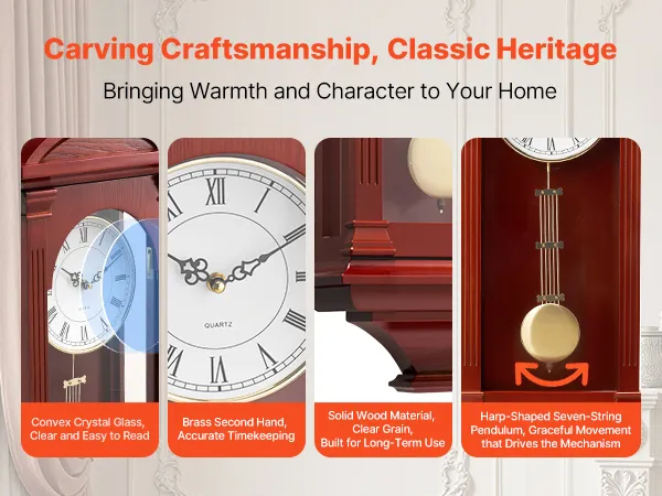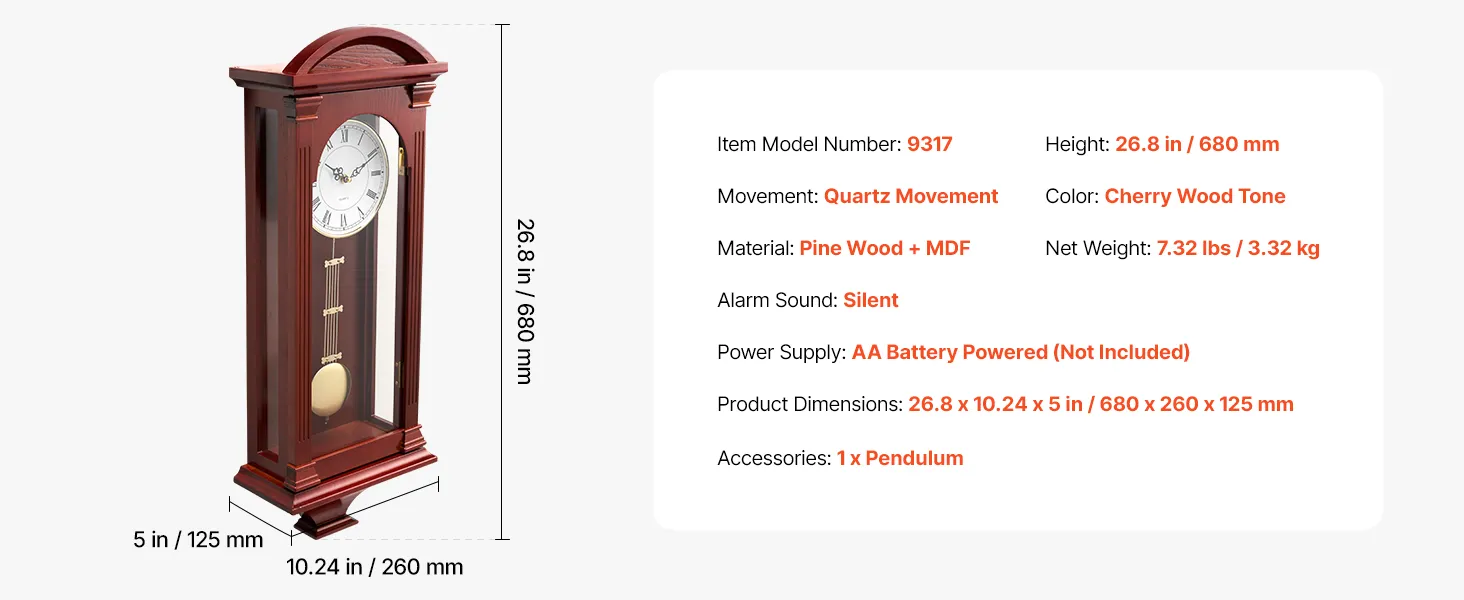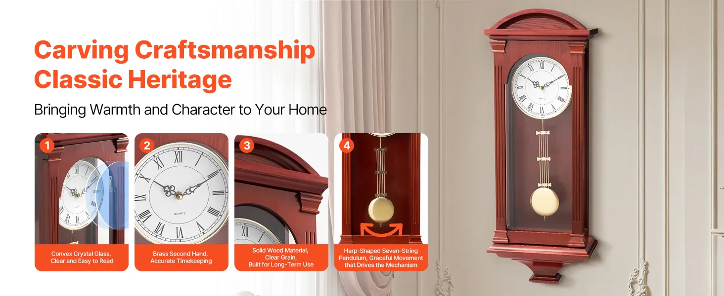 Cronometraje preciso: El reloj de péndulo cuenta con un movimiento de cuarzo de alta precisión que garantiza la precisión de cada segundo. Te acompañará en cada momento importante, ya sea en el día a día o en ocasiones especiales
