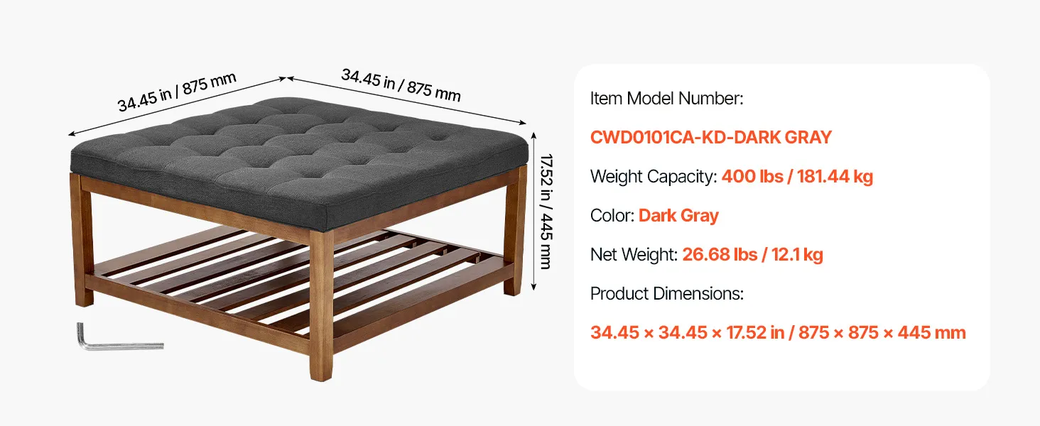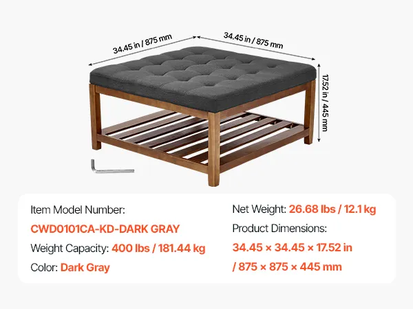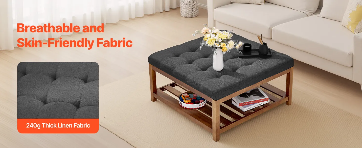 VEVOR Mesa de Centro Otomana, 875 x 875 x 445 mm, Mesa de Café Cuadrada con Estante de Madera Maciza y Reposapiés Tapizado en Lino para Sala de Estar, Capacidad de 181,44 kg, Gris Oscuro