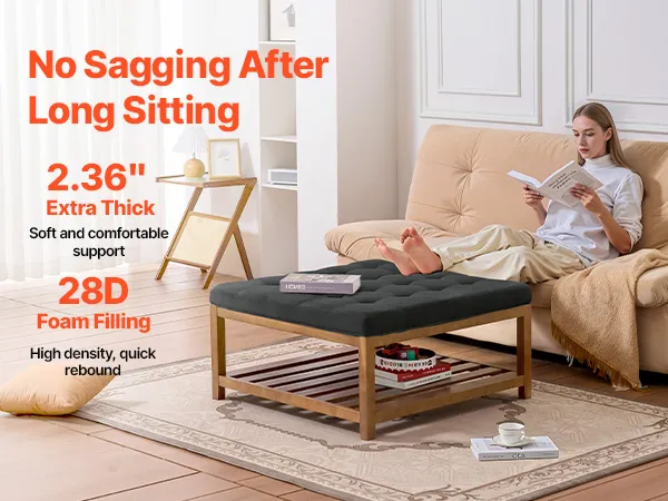 Nuestra mesa de centro otomana cuadrada está hecha de espuma 28D gruesa y altamente resistente que no se aplana con el tiempo, lo que garantiza una rápida recuperación y un soporte suave y duradero. Mantiene la comodidad y la forma incluso con un uso prolongado.