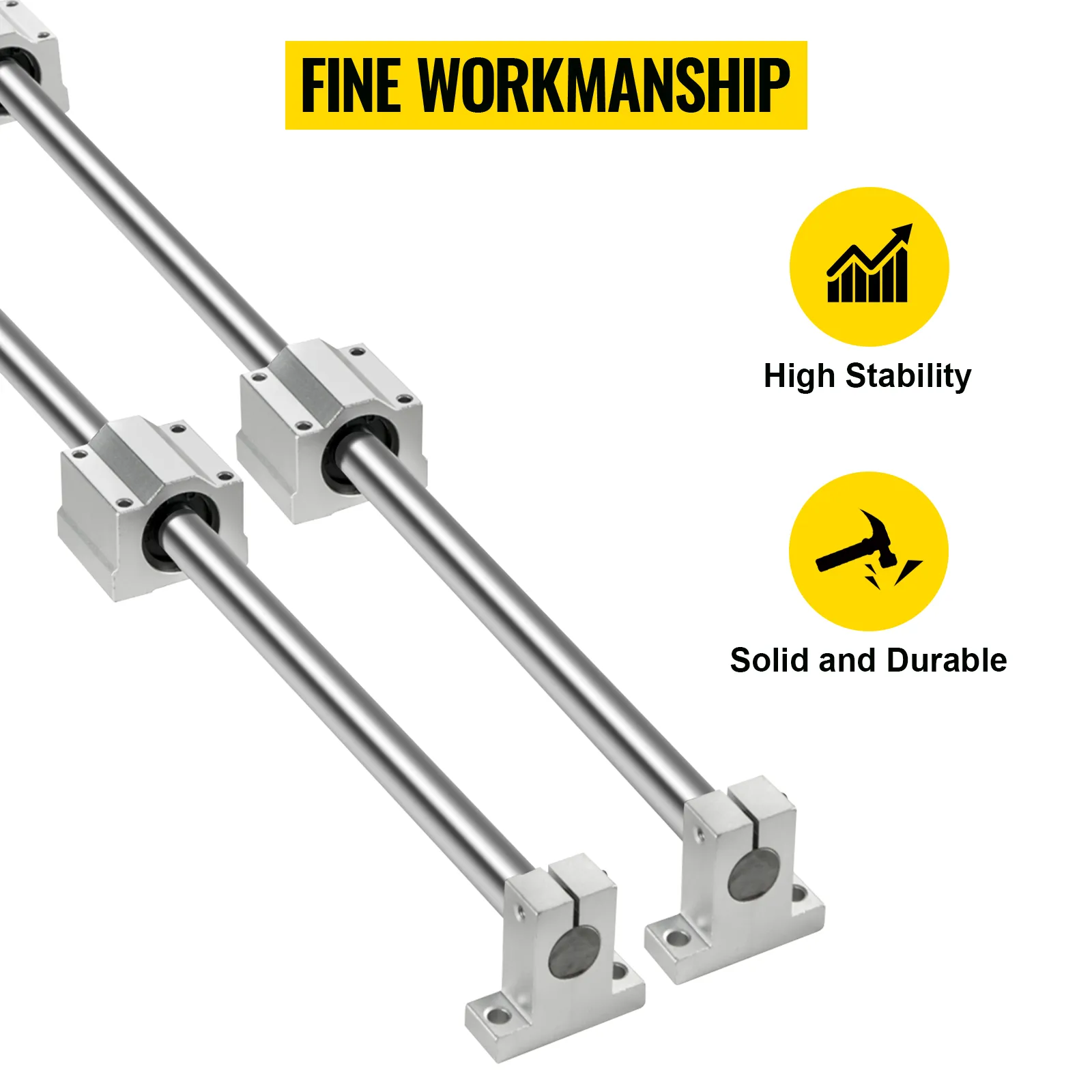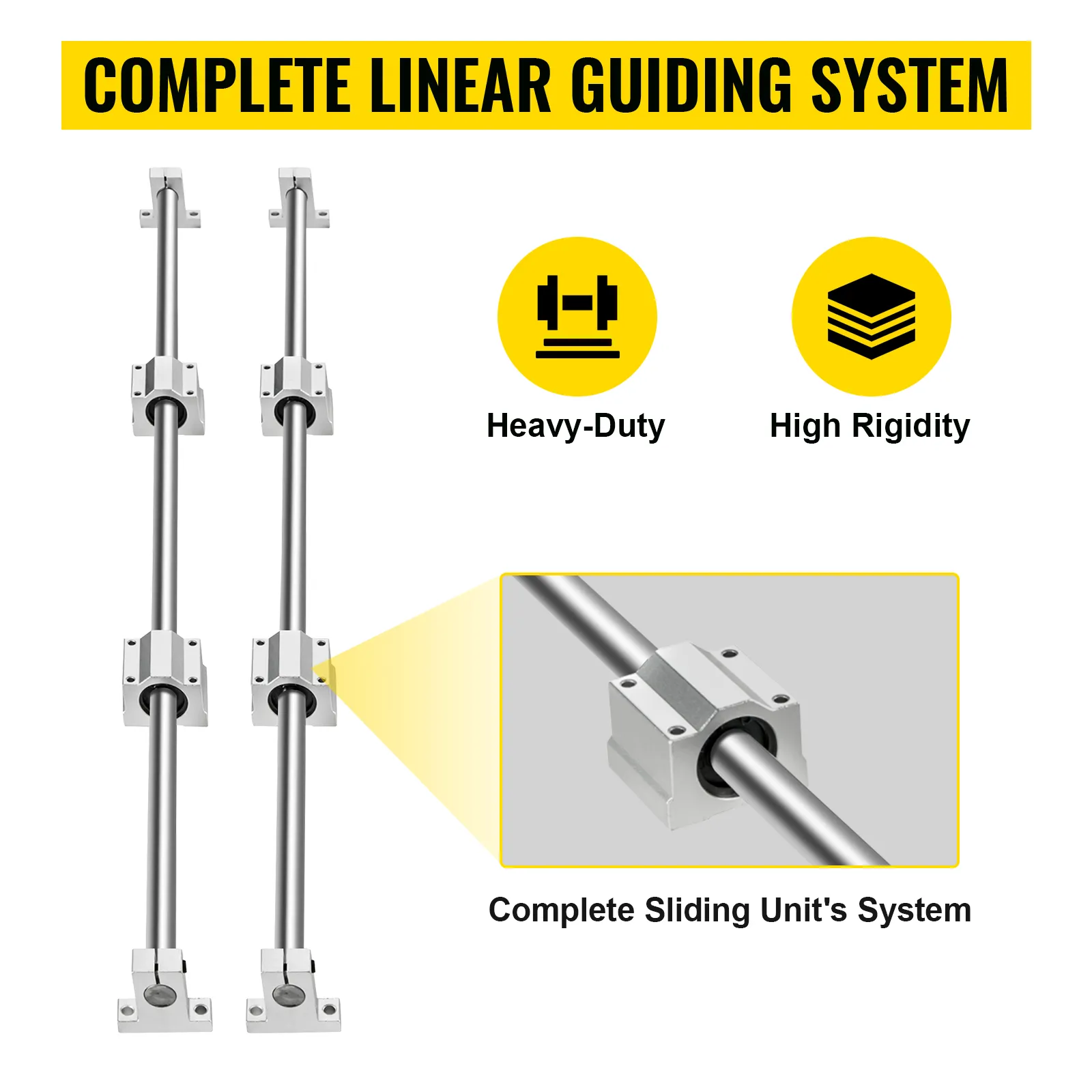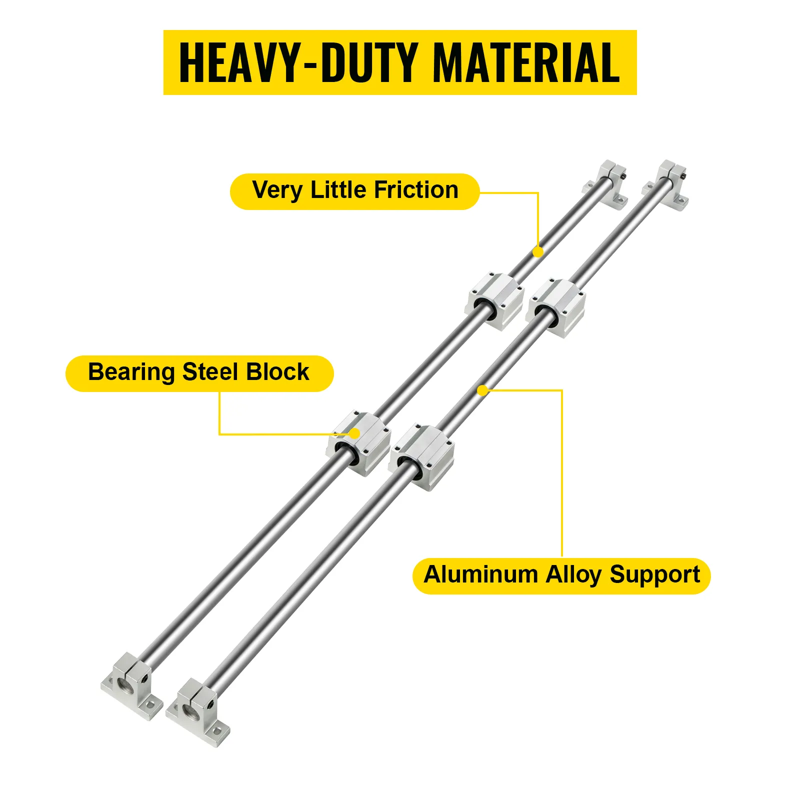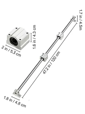 El kit de riel CNC incluye 2 ejes lineales cromados de 47,2 pulgadas / 1200 mm; 4 soportes de eje fijo SK16; 4 rodamientos de bloque de pilares SCS16UU. El eje central de acero con rodamientos es sólido y duradero, lo que hace que tenga una larga vida útil.