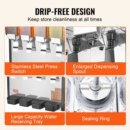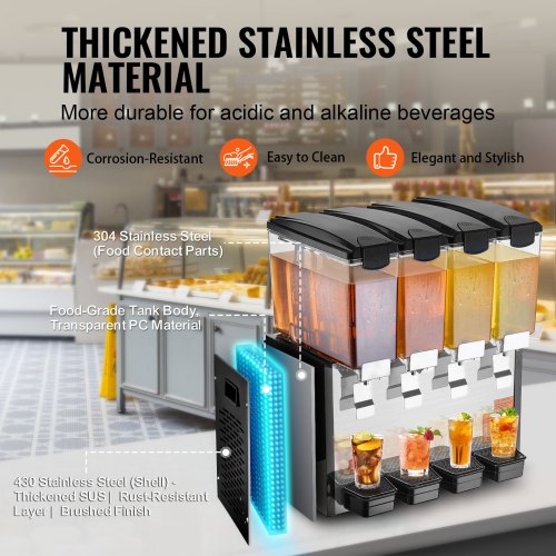 VEVOR Dispensador de Bebidas Comercial 12L x 4 Tanques Máquina de Bebidas Frías Heladas de Acero Inoxidable 510 W Temperatura de Enfriamiento 7~12°C para Restaurantes, Bares, Fiestas, 75,5x43x67 cm