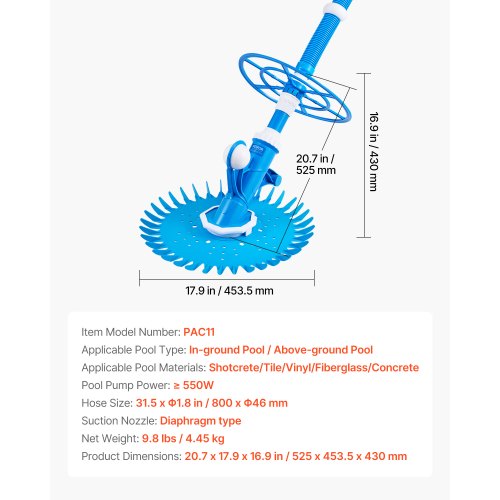 VEVOR Limpiador Automático de Piscinas por Succión 525 x 453,5 x 430 mm, Aspiradora de Membrana de Succión Lateral, Barredora por Succión con 12 Mangueras para Piscinas Enterradas y Elevadas