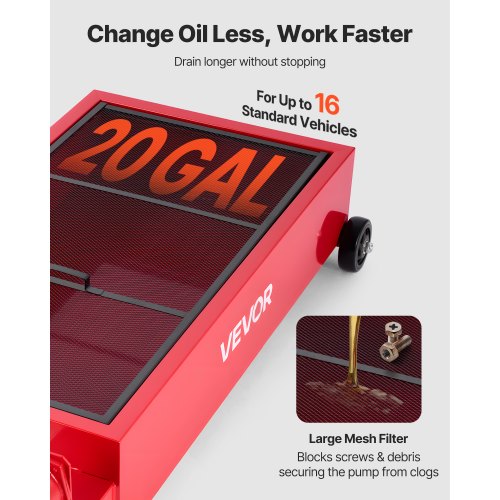 VEVOR Bandeja de Drenaje de Aceite de Perfil Bajo, Capacidad 75,7 L, con Ruedas y Bomba Manual, Manguera de 2,2 m y Asa Plegable en T, Resistente a la Corrosión, para Coches, SUV, Camiones, Rojo