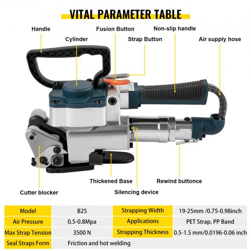 VEVOR Máquina Portátil de Embalaje de Paquetes Ancho de Flejado 19-25mm, Herramienta Neumática de Flejado para PP y PET Espesor de Flejado 0,5-1,5mm Máquina Neumática de Flejado Tensión Máxima 3500N