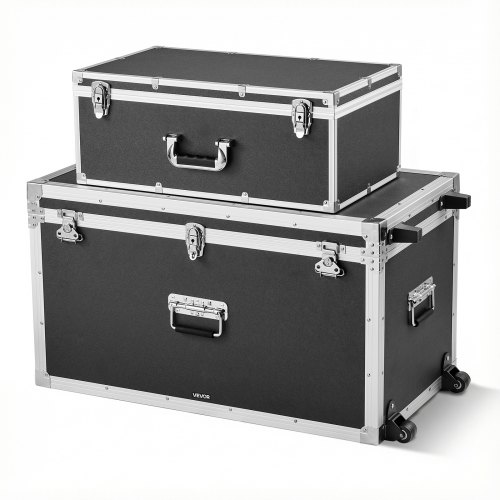 VEVOR Cajas de Transporte y Almacenamiento 2 Piezas, Pequeña de 600 x 350 x 240 mm, Grande de 763 x 392 x 312 mm con Ruedas, Caja de Madera con Cerradura Asas de Metal, para Viajes Equipo, Color Negro
