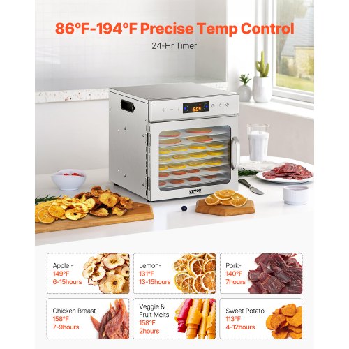 VEVOR Deshidratador de Alimentos 6 Bandejas de Acero Inoxidable Secador de Alimentos Eléctrico 400 W con Temperatura Ajustable y Temporizador de 24 Horas para Cecina, Frutas, Verduras, Hierbas