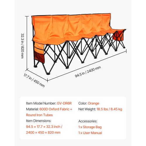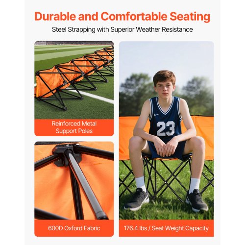 VEVOR Silla Plegable de 6 Plazas, Asiento de Banco Plegable con Bolsillos Laterales y Bolsa de Transporte, Banco Lateral para Gradas con Respaldo para Camping, Actividades al Aire Libre, Naranja