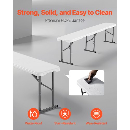 Banco plegable de plástico VEVOR, banco plegable portátil de 6 pies, banco exterior impermeable de HDPE suave, asiento para pícnic, camping, comedor con asa de transporte, para actividades de entretenimiento en el jardín, fútbol, blanco (paquete de 2)