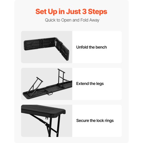 Banco plegable de plástico VEVOR, banco plegable portátil de 6 pies, banco exterior impermeable de HDPE suave, asiento para picnic, camping, comedor con asa de transporte, para actividades de entretenimiento en el jardín, fútbol, color negro (paquete de 1)