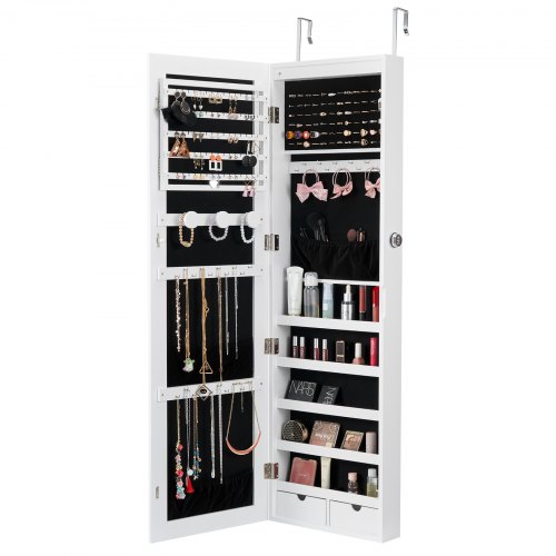 VEVOR Armario para Joyas de 108 cm de Alto con Cerradura y Espejo de Cuerpo Entero, Armario de Joyas con Espejo para Montaje en Pared o Puerta con Luces LED Interiores y Forro de Terciopelo, Blanco