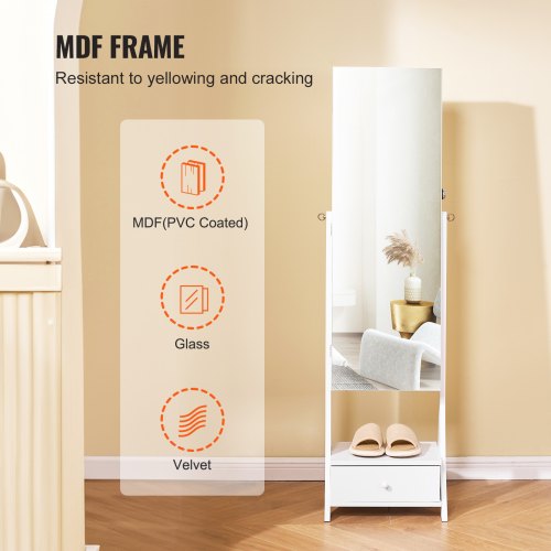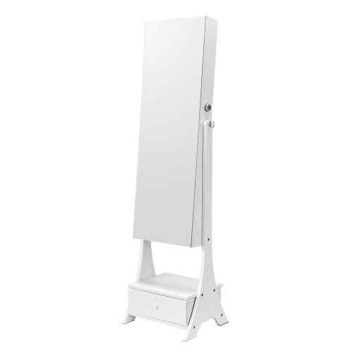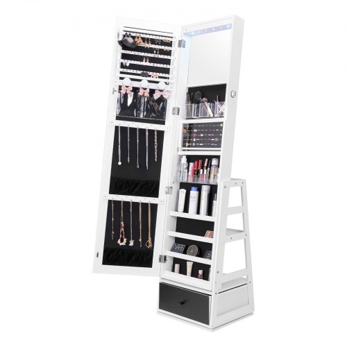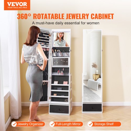 VEVOR Armario para Joyas con Espejo Giratorio de 360°, Organizador de Espejos 390 x 367 x 1600 mm para Joyas con Cerradura y Espejo de Cuerpo Entero, Forro de Terciopelo, Luz LED, Cajón, Blanco