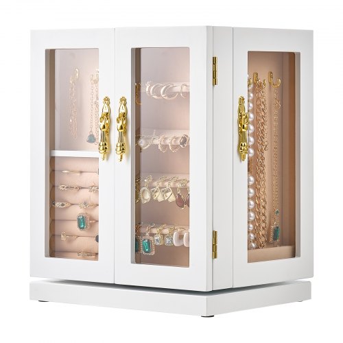 VEVOR Joyero, Joyero Giratorio de 360° con Puerta Magnética, Ventana de Acrílico y 4 Ganchos para Collares Integrados, Asas de Metal, Almohadilla Inferior y Forro de Franela Suave, Color Blanco