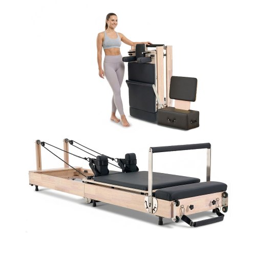 VEVOR Reformer de Pilates de Madera Plegable Máquina de Pilates para Gimnasio Equipo de Pilates Doble Resistencia Resorte y Cuerda Reformador con Caja para Sentarse Hasta 181,4 kg, 252x62x77 cm