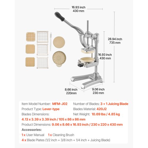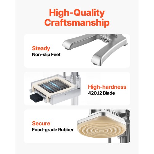 VEVOR Cortador de Papas Fritas Picador de Frutas y Verduras de Acero Inoxidable con 3 Cuchillas de Repuesto de 12,7 / 9,525 / 6,35 mm y 1 Cuchilla Exprimidora Cortador Manual de Papas para Cocina