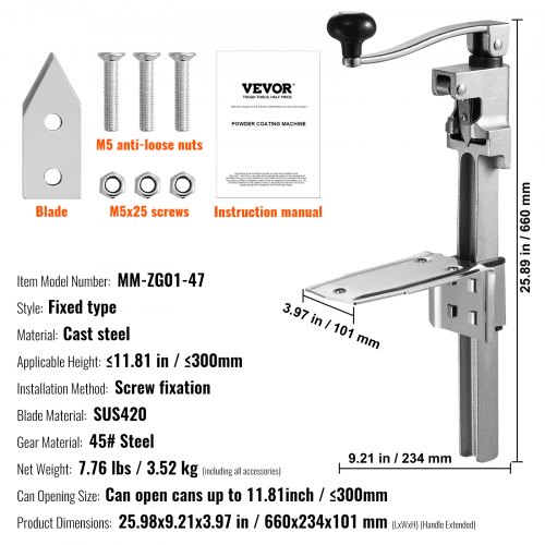 VEVOR Abrelatas, Abrelatas Manual de Sobremesa para Latas de hasta 30 cm de Altura, Altura Ajustable con Tornillos, Acero Fundido para Restaurantes y Hoteles, Tipo Fijo, 235 x 100 x 660 mm