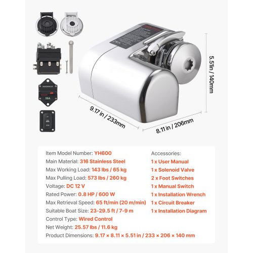 VEVOR Molinete de Ancla Eléctrico de 12 V CC, 600 W, para Cadenas de 6,35 mm y Cuerdas de Nailon de 14 a 16 mm, Carga de Tracción de 260 kg, para Embarcaciones de 7 a 9 m, 233 x 206 x 140 mm
