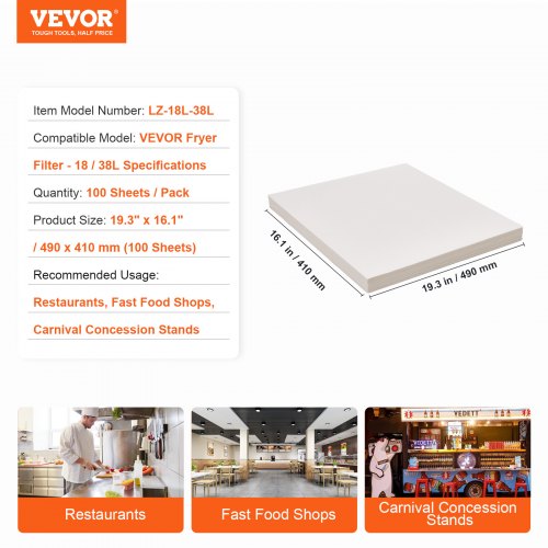 VEVOR Papel de Filtro para Freidora 100 Hojas 490 x 410 mm Hojas de Filtro de Repuesto para Freidora Comercial de 18L/38L para Restaurante, Tienda de Comida Rápida, Puesto de Concesión de Carnaval