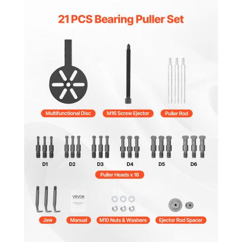 VEVOR Juego de Extractores Multifuncional de Rodamientos 21 en 1 para Rodamientos Internos y Externos, Fácil de Usar, 3 Mordazas, con Estuche Portátil Resistente, 270 x 215 x 60 mm, Azul y Negro