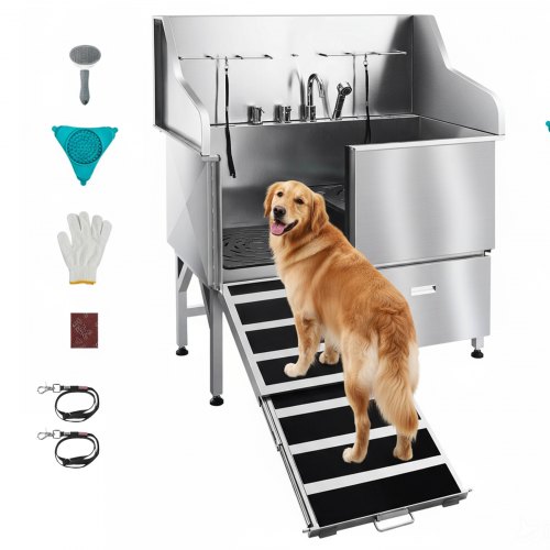 VEVOR Estación de Lavado para Perros de Acero Inoxidable, Bañera de 961 x 620 x 1220 mm con Escalera de Almacenamiento, Grifo, Ducha y Jabonera para Mascotas de Varios Tamaños, Puerta Derecha