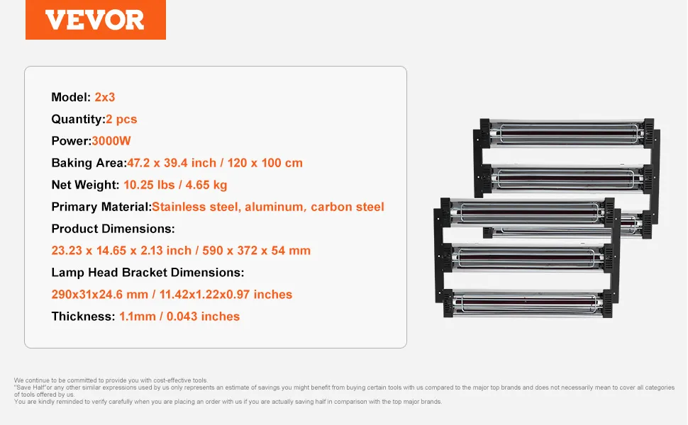 VEVOR Lámpara de Secado de Pintura 3000 W 2 Piezas Secado Rápido 220 V Cobertura de 120 x 100 cm Cuadrados para Cabinas de Pulverización/Horneado, para Pintura Automotriz, 54 x 30 cm, 8000 Horas