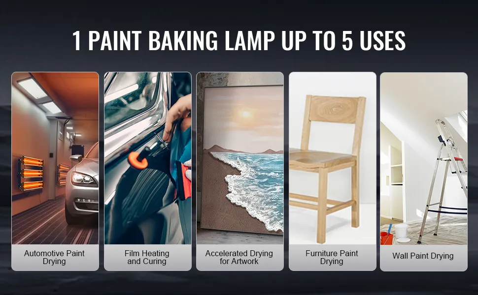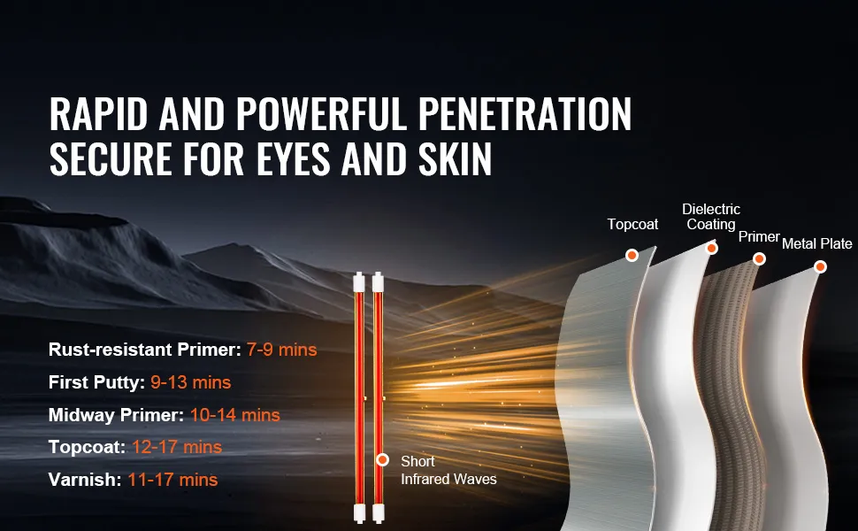 Secado rápido: Imprimación de secado rápido de 3000 W con un área de secado de 47,2 x 39,4 pulgadas, alta penetración de infrarrojos de onda corta y tubos de lámpara de cuarzo que mejoran el brillo. Diseñado para usuarios que buscan resultados de pintura eficientes, rápidos y de alta calidad.